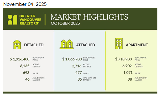 Sales of apartment homes reached 1,071 in October 2025, a 23.1 per cent decrease compared to the 1,393 sales in October 2024. The benchmark price of an apartment home is $718,900. This represents a 5.1 per cent decrease from October 2024 and a 1.4 per cent decrease compared to September 2025.
